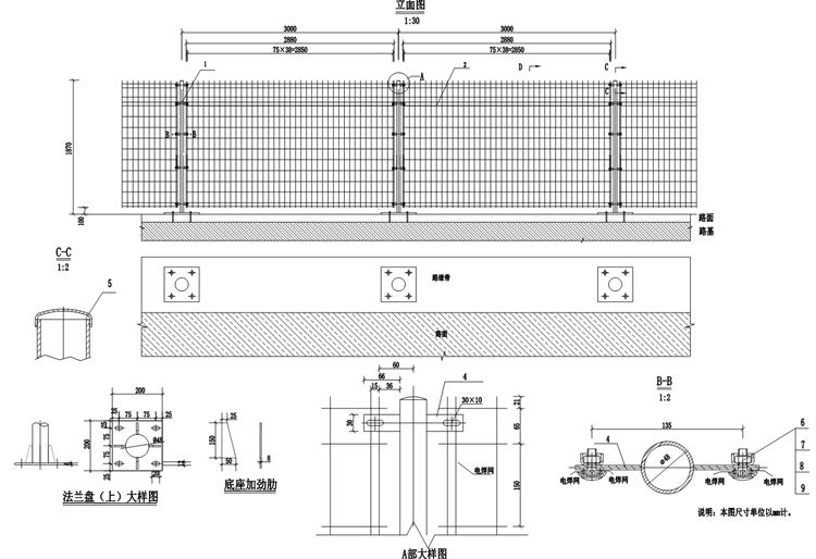 4.F-Ww-C焊接網(wǎng)隔離柵每隔24m間距設(shè)置一個斜撐,在F-Ww-C焊接網(wǎng)隔離柵改變方向的地方和端頭應設(shè)斜撐,或兩側(cè)加斜撐。