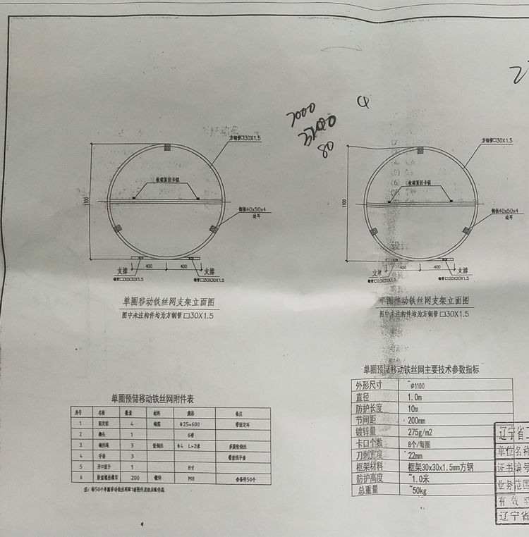三、單圈移動鐵絲網(wǎng)參數(shù)說明: