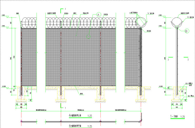 3、監(jiān)獄隔離網(wǎng)安裝高度詳立面圖,立柱中心距2520±5mm。