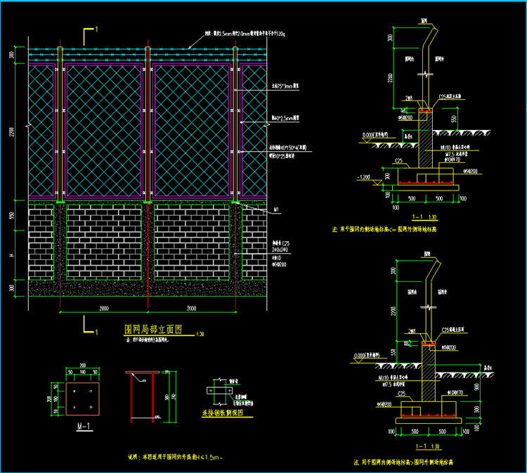 3、上部:橫排列三根帶刺鐵絲網(wǎng),每根間距0.1米或高為0.3米的金屬網(wǎng)。