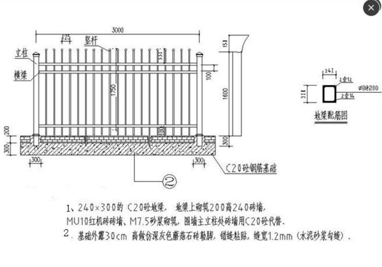 5、鋅鋼護(hù)欄圍欄固定方式:主立柱在澆筑砼基礎(chǔ)時(shí)一并埋入砼中 300 深(立柱總長(zhǎng) 1.9 米),單片圍欄要有 2 條豎條加長(zhǎng)埋 入砼中(加強(qiáng)抗風(fēng)性)。