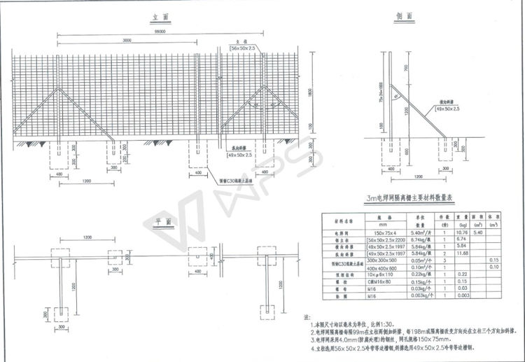 1、本圖電焊網(wǎng)隔離柵尺寸均以毫米為單位,比例1:30。