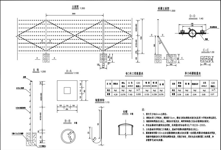 全線除天然屏障處(河流、溝渠等),其余地方(包括旱橋部分)均連續(xù)設(shè)置結(jié)構(gòu)合理、美觀大方的刺鐵絲隔離柵。一般路段采用刺鐵絲隔離柵。刺鐵絲隔離柵應(yīng)設(shè)在路基兩側(cè)用地界碑內(nèi)0.3米處,地形有起伏時,刺鐵絲隔離柵按階梯形設(shè)置;刺鐵絲隔離柵遇到≤3米的溝渠或涵洞時,可采用直接經(jīng)過;每段刺鐵絲隔離柵的起終點或刺鐵絲隔離柵需要斷開的地方,應(yīng)針對不同的情況做端頭圍封,在刺鐵絲隔離柵需改變方向的地方,應(yīng)做拐角處理。刺鐵絲隔離柵基礎(chǔ)預(yù)制施工。為滿足公路、橋梁和通道等養(yǎng)護(hù)管理的需要,可在適當(dāng)位置設(shè)置便于開啟以滿足車輛或人員進(jìn)出的刺鐵絲隔離柵活動門,刺鐵絲隔離柵的立柱需要根據(jù)活動門的大小和開啟情況進(jìn)行加強(qiáng)。刺鐵絲隔離柵的鋼構(gòu)件均應(yīng)做熱浸鍍鋅防腐處理。鍍鋅時應(yīng)符合下表的規(guī)定,熱浸鍍鋅所用的鋅應(yīng)為符合《高速公路交通工程鋼構(gòu)件防腐技術(shù)條件》中引用的GB/T470中所規(guī)定的0號或1號鋅錠。鍍鋅后再鍍塑,顏色為果綠色。