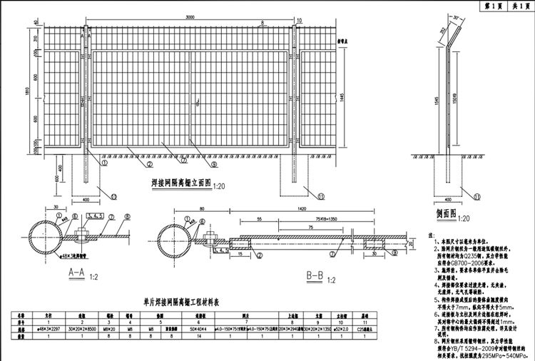 2、焊接網(wǎng)隔離柵除網(wǎng)片鋼絲為一般用途低碳鋼絲外,所有鋼材均為Q235鋼,其力學(xué)性能應(yīng)符合GB700-2006要求。
