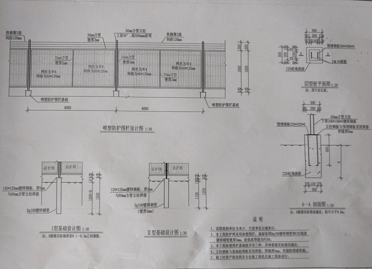 3、本工程水源地噴塑防護(hù)圍欄基礎(chǔ)樁共有三種,具體根據(jù)實(shí)際情況確定。
