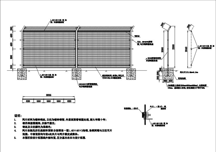 4.網(wǎng)片安裝完后在底部和頂部分別增設(shè)一道L40X40X3角鋼,角鋼兩端與立柱耳片連接,中部均勻設(shè)4處夾片與網(wǎng)片鎖定成整體。