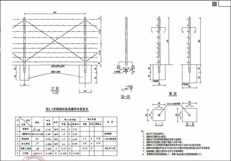 刺鋼絲網隔離柵采用圓鋼管立柱。刺絲采用 12 號低碳鋼絲或低合金鋼絲制作,應符合《一 般用途低碳鋼絲》(GB343)、《一般用途熱鍍鋅低碳鋼絲》的規(guī)定。刺鋼絲網隔離柵立柱、斜撐、門柱采用先鍍鋅后浸塑方式,鍍鋅量不得低于 275g/㎡,緊固件、連接件為 120g/㎡,涂塑層厚度應大于 0.25mm。具體參見《公路交通工程鋼構件防腐蝕技術條件》(GB∕T18226-2015)。