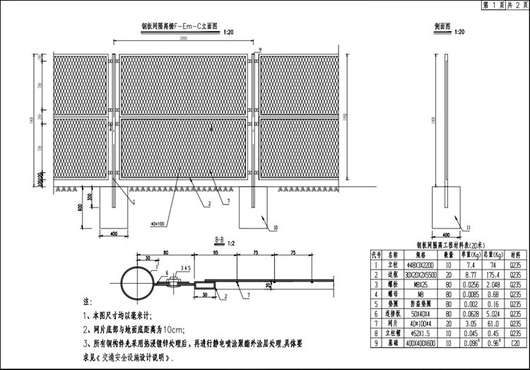 考慮到改擴(kuò)建期間隔離柵臨時圍避利用的因素,本設(shè)計中一般路段主要采用了鋼板網(wǎng)型式,對風(fēng)景區(qū)、旅游區(qū)、著名地點、水源保護(hù)區(qū)等區(qū)段采用鋼板網(wǎng)隔離柵。鋼板網(wǎng)隔離柵由網(wǎng)片、邊框、立柱等構(gòu)件組成,現(xiàn)場連接。為方便道路養(yǎng)護(hù)人員的進(jìn)出,在大橋、特大橋橋臺處隔離柵設(shè)置檢修門。隔離柵基礎(chǔ)均為C20號混凝土。