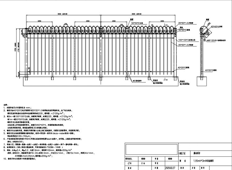 2.騰訊項目柵欄片由40*20*2的方管橫桿與20*20*1.0的帶槍尖豎桿焊接而成,出廠時為成品;橫桿及豎桿的基材為優(yōu)質(zhì)冷軋熱鍍鋅管材Q235 ,鍍鋅量: +Z120g/㎡ 。
