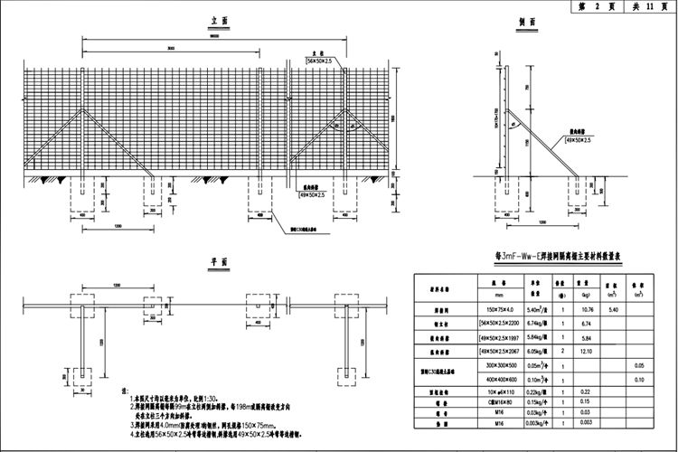 本圖尺寸均以毫米為單位,比例1:30。焊接網(wǎng)隔離柵每隔99m在立柱兩側(cè)加斜撐,每198m或隔離柵改變方向處在立柱三個方向加斜撐。焊接網(wǎng)采用4.0mm(防腐處理)的鋼絲,網(wǎng)孔規(guī)格150X75mm。立柱選用56X50X2.5冷彎等邊槽鋼,斜撐選用49X50X2.5冷彎等邊槽鋼。隔離柵設(shè)置于公路用地界內(nèi)側(cè)0.3m 處,地形有起伏時,片網(wǎng)隔離柵按階梯形設(shè)置;片網(wǎng)隔離柵遇到≤3m 的溝渠或涵洞時,可直接跨過,但在跨躍處需設(shè)置異形網(wǎng)片,防止人或動物由此進入。每段隔離柵的起終點或隔離柵需要斷開的地方,應(yīng)針對不同的情況做端頭圍封,在隔離柵需改變方向的地方,應(yīng)做拐角處理。焊接片網(wǎng)隔離柵采用熱浸鍍鋅涂塑處理,螺栓、螺母、墊圈等連接件的鍍鋅量為120g/㎡,立柱等構(gòu)件為275g/㎡,網(wǎng)片塑層厚度不小于0.3mm。立柱等鋼構(gòu)件塑層厚度不小于76μm,焊接網(wǎng)隔離柵的鋼構(gòu)件均應(yīng)作熱浸鍍鋅后鍍塑處理。鍍鋅時應(yīng)符合下表的規(guī)定,熱浸鍍鋅所用的鋅應(yīng)為符合《公路交通工程鋼構(gòu)件防腐技術(shù)條件》中引用的 GB/T470中所規(guī)定的特1號或1號鋅錠,鍍鋅后再浸塑或噴塑,顏色為果綠色。所有鋼構(gòu)件均應(yīng)進行熱浸鍍鋅涂塑處理,螺栓、螺母、墊圈等連接件的鍍鋅量為120g/㎡,其它構(gòu)件為275g/㎡,網(wǎng)片塑層厚度不小于0.3mm。其它鋼構(gòu)件涂塑層厚度不小于76μm。
