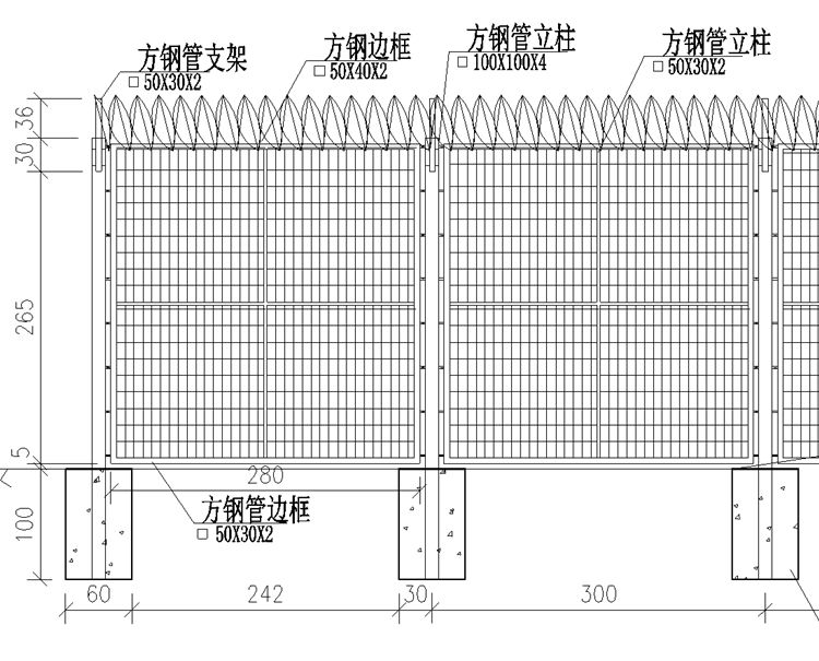 1、防護(hù)柵欄型式采用3.0m高,混凝土基礎(chǔ)型鋼立柱, 浸塑網(wǎng)片柵欄。即由鋼絲網(wǎng)片(60x30x4)焊接在鋼邊框上,鋼邊框通過防盜螺栓固定在鋼立柱上。