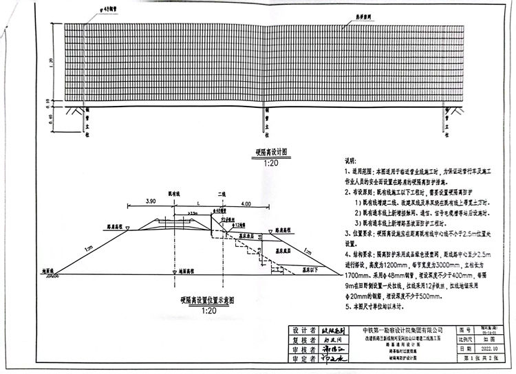 1.適用范圍:本圖適用于臨近營(yíng)業(yè)線施工時(shí),為保證運(yùn)營(yíng)行車及施工作業(yè)人員的安全而設(shè)置在路肩的硬隔離防護(hù)措施。