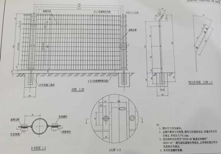 混凝土立柱用混凝土標(biāo)號(hào)不低于C20,拌制混凝土所使用的各項(xiàng)材料及混凝土的配合比、拌制、澆筑、養(yǎng)護(hù)應(yīng)滿(mǎn)足有關(guān)標(biāo)準(zhǔn)的規(guī)定。電焊網(wǎng)的立柱、斜撐采用有縫焊接鋼管,其公稱(chēng)尺寸為Φ48X3.5mm,斜撐采用角鋼。刺鋼絲隔離柵的立柱與電焊網(wǎng)(包括網(wǎng)片與立柱等)均為綠色,其具體顏色須經(jīng)業(yè)主確認(rèn)后方