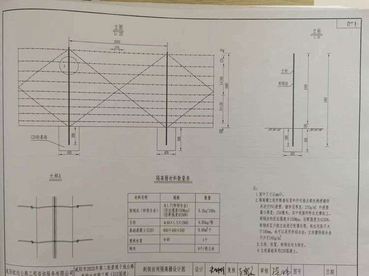 4.刺鋼絲網(wǎng)隔離柵立柱基礎(chǔ)采用C20混凝土。