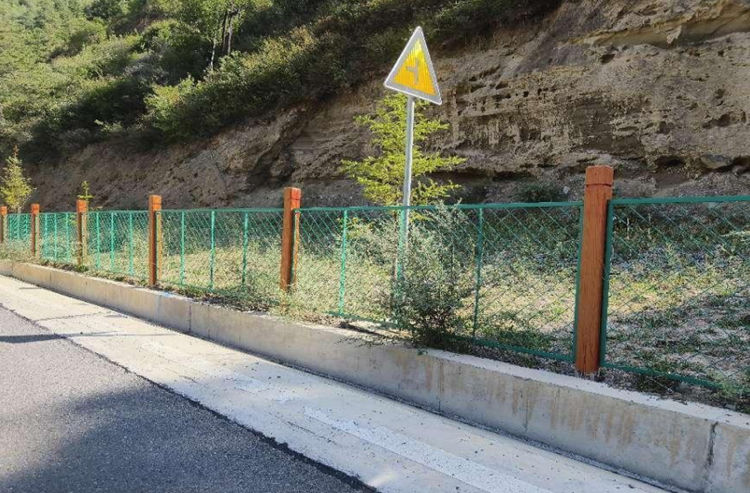 農田防護網(wǎng)立柱做法:預埋C25砼立柱高1.8m(120mmx120mmx1800mm),表層涂刷5mm 仿木石漆,提前在立柱上預埋M20*130螺栓,立柱和網(wǎng)片通過焊接連接,用螺絲將連接件固定在一起。