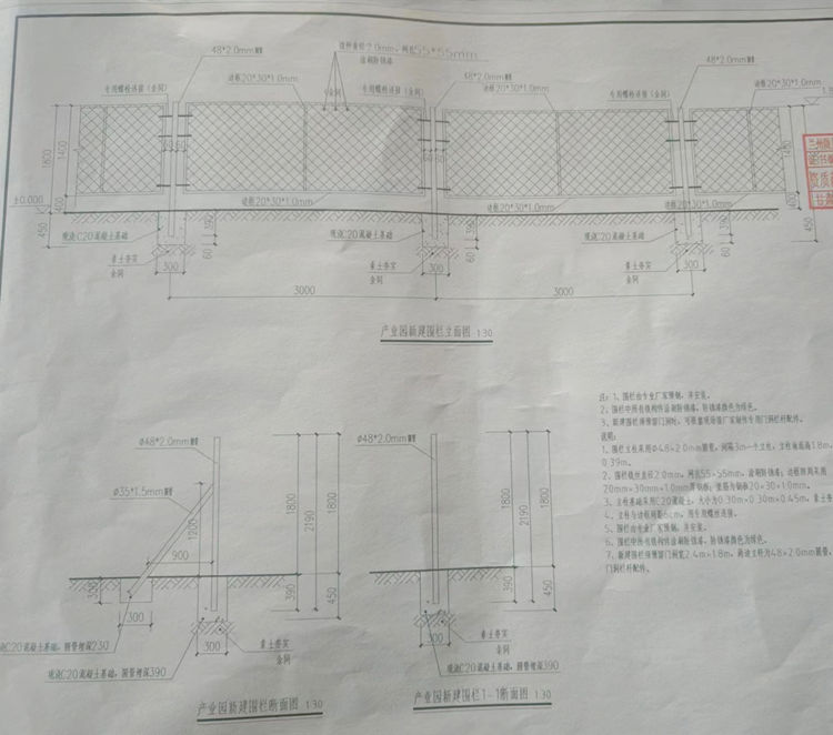 4、鋼絲網(wǎng)圍欄立柱采用φ48x2.0mm圓管,間隔3m一個(gè)立柱,立柱地面高1.8m,埋深0.39m。