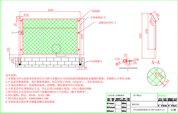 1.本圖紙為中石油管道有限責任公司西氣東輸分公司站場及閥室圍墻頂部金屬隔離網圖紙,本圖紙尺寸單位為MM。