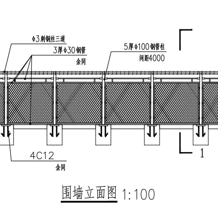 1、保稅區(qū)圍網(wǎng)立柱采用Φ100*5.0mm鍍鋅鋼管制作而成,立柱間距4000mm,立柱焊接法蘭盤(pán),打膨脹螺絲固定立柱。