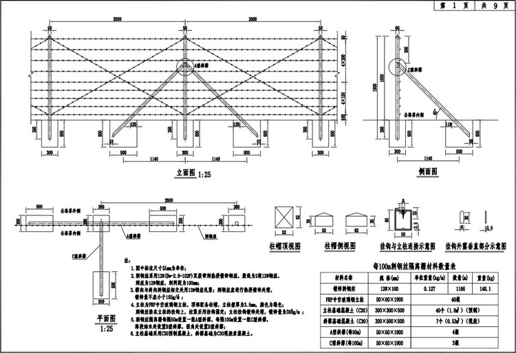 6.刺鋼絲隔離柵立柱基礎采用C30預制混凝土,斜撐基礎為C30現澆素混凝土。