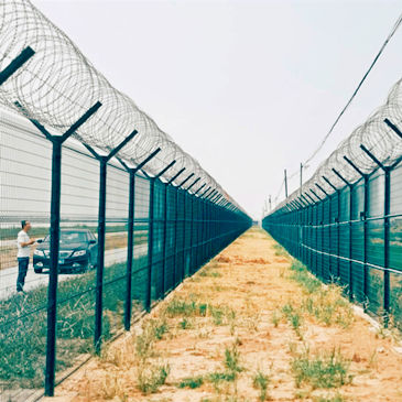8. 高密網防護網頂部設一道蛇腹型刀刺網,刀刺網材質為304不銹鋼,圈徑不小于600mm,每米長度不少于7圈,圈距排列均勻,刀片形式為BTO-22(芯線直徑為2.5±0.1mm,刀片厚0.5±0.05mm,刀片長22±1mm,刀片寬15±1mm,刀片間距為36±1mm)。
