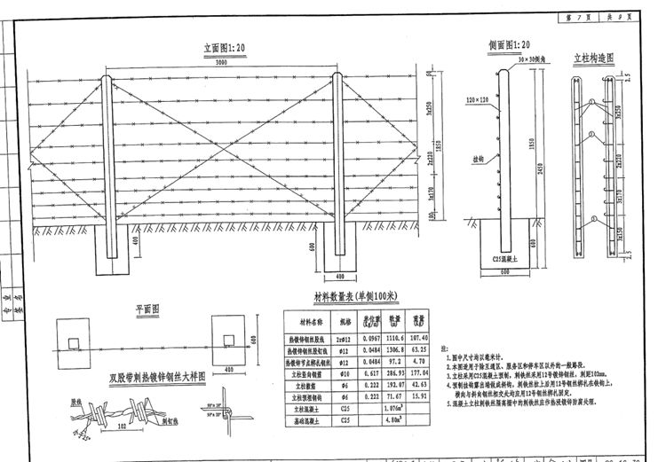 3.刺鋼絲圍欄立柱采用C25混凝土預(yù)制,刺鋼絲采用12號鍍鋅鋼絲,刺距102mm。