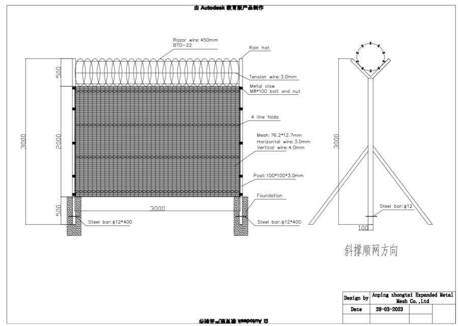 圍欄·面板規(guī)格:面板尺寸3305mmx2500mm,孔徑尺寸(中心)76.2mmx 12.7mm,電線尺寸定制(最小4mm/4mm)、水亞帶4x50mm深V法蘭2x70°x75mm+2x30°或2x90°x50mm、包括通孔螺栓系統(tǒng)立柱規(guī)格:柵欄板高度2.5米,立柱長度至少3.0米,立柱尺寸85mmx45mmx85mm錐形柱或150mmx75mmx150mm 錐形柱鎖定凹槽機(jī)制包括,包括聚合物蓋,后處理鍍鋅并涂有鋁。