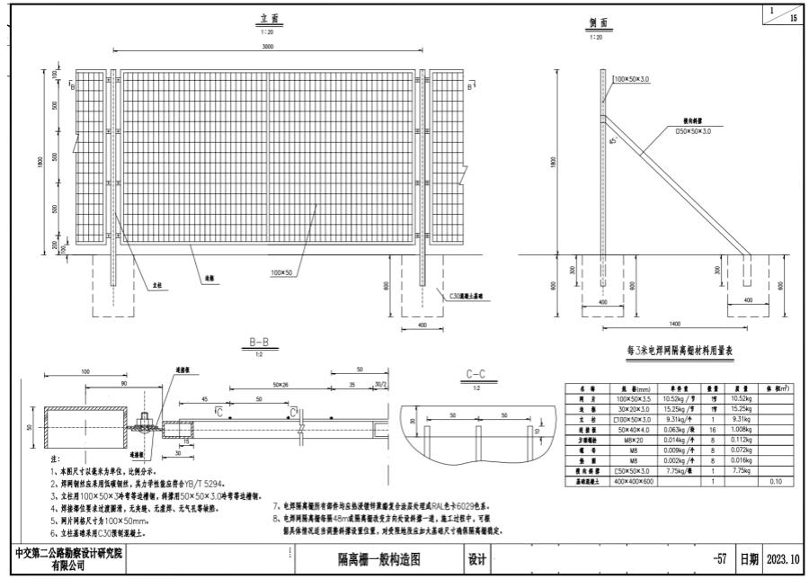 8、電焊網(wǎng)隔離柵每隔48m或隔離柵改變方向處設(shè)斜撐一道,施工過程中,可根據(jù)具體情況適當(dāng)調(diào)整斜撐設(shè)置位置,對受限地段應(yīng)加大基礎(chǔ)尺寸確保隔離柵穩(wěn)定。