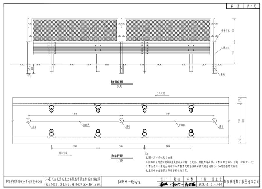 3.支撐立柱、橫梁、連接鋼板等鋼構(gòu)件采用熱浸鍍鋅浸塑復(fù)合涂層防腐處理,鍍鋅量為275g/㎡,緊固件的鍍鋅量為120g/㎡,浸層厚度大于0.25mm。顏色為薄荷綠;支撐間距為4米,且防眩網(wǎng)每12米斷開(kāi)一次。