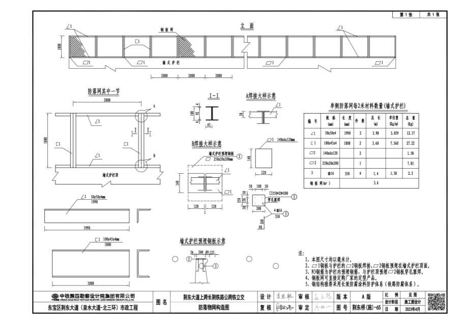 全橋范圍橋面兩側(cè)均設(shè)置防拋網(wǎng),避免橋上拋物,不利于鐵路安全。防拋網(wǎng)設(shè)置在外側(cè)HA級防撞墻墻頂上,頂面高出人行道不小于2.5m。防拋網(wǎng)格柵采用2m一段的金屬網(wǎng)、直徑不小于6mm的鋼絲,網(wǎng)眼不大于2.5cm,鋼絲網(wǎng)表面采用熱鍍鋅+浸塑處理,熱鍍鋅量 270g/㎡,浸塑厚度0.8~1.2mm,浸塑顏色為墨綠色。防拋網(wǎng)上設(shè)置“高壓危險(xiǎn)”警示標(biāo)志。