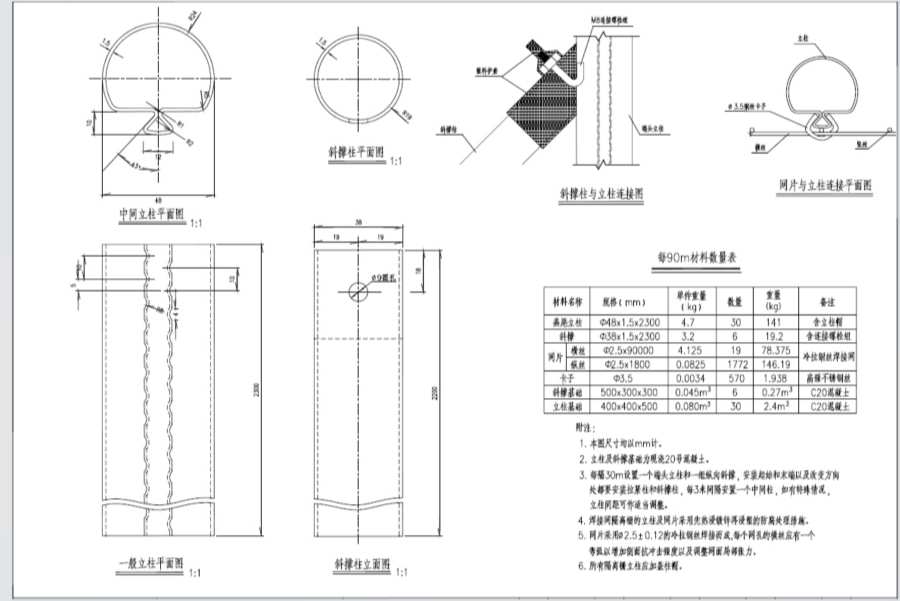 3.每30m設(shè)置一個端頭立柱和一組縱向斜撐,安裝起始和末端以及改變方向處都要安裝拉緊柱和斜捧柱,每3米間隔安置一個中間柱,如有特珠情況,立柱間距可作適當(dāng)調(diào)整。