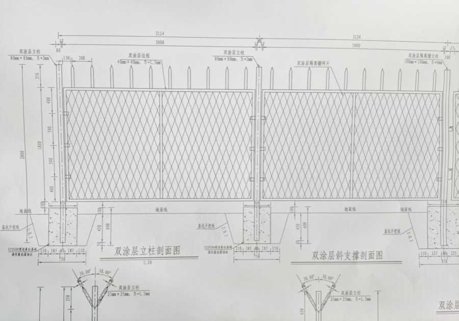 2、雙涂層隔離柵Gw-3.0-55: (網(wǎng)片采用鋼片網(wǎng),網(wǎng)片規(guī)格3mx1.8m,厚度3.0m,網(wǎng)孔尺寸55mmx150mm(菱形對(duì)角尺寸),邊框及豎桿方管40mmx40mmx1.5mm,配件包括:防雨帽、連接卡及防盜螺栓等):方管立柱采用80mmx80mm,壁厚3.0m,單根立柱長(zhǎng)2.8m,間距3m,立柱與網(wǎng)片的連接方式為焊接。立柱基礎(chǔ)C25F200(高性能抗腐蝕砼)現(xiàn)澆混凝土基礎(chǔ),規(guī)格尺寸:0.45x0.45x0.6m(長(zhǎng)x寬x高)。