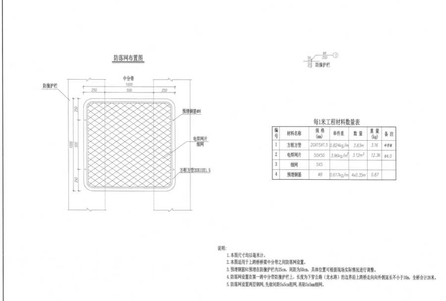 4.防落網(wǎng)設(shè)置在第一跨中分帶防撞護(hù)爛上,長(zhǎng)度為下穿公路(龍水路)的邊界沿上跨橋走向向外制延長(zhǎng)不小于10m,全橋合計(jì)26米。